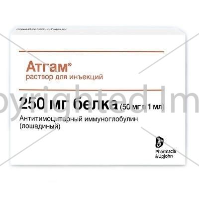 Фармакологічна діяАтгам - імунодепресивний препарат. Атгам є виборчим імунодепресантом, що знижує кількість циркулюючих тімусзавісімих лімфоцитів, що утворюють розетки з еритроцитами барана. Вважається, що це антилімфоцитарними дію відображає зміну функції Т-лімфоцитів, що відповідають за клітинний імунітет і беруть участь в гуморальній імунній відповіді. На додаток до антилімфоцитарну активності Атгам містить в невеликій концентрації антитіла проти інших формених елементів крові. У мавп rhesus і cynomolgus Атгам знижує кількість лімфоцитів в тімусзавісімих зонах селезінки і лімфатичних вузлів.