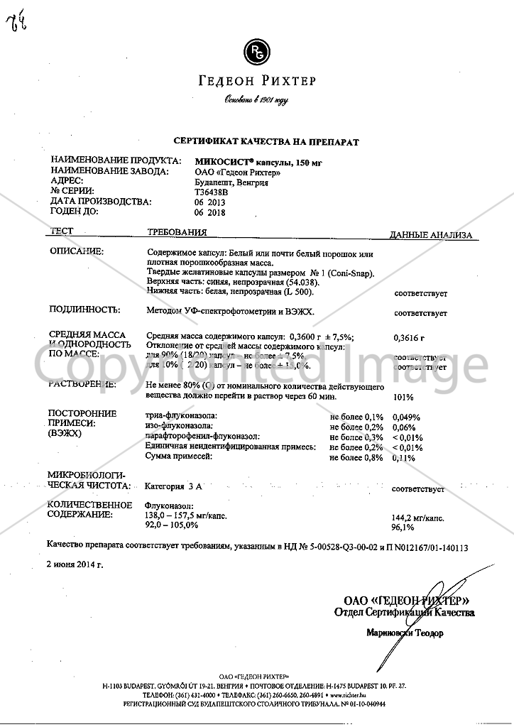 Похожее видеоДополнительная информацияМикосист капсулы 150 мг, 4 шт. производит Гедеон Рихтер, страна производства Венгрия. Если Вы заинтересовались эти товаром, обязательно посмотрите его аналоги: Дифлюкан р-р для в/вен. введ. 2 мг/мл 200 мл флаконы 1 шт., Дифлюкан р-р для в/вен. введ. 2 мг/мл 50 мл флаконы 1 шт., Дифлюкан р-р для в/вен. введ. 2 мг/мл 100 мл флаконы 1 шт., Дифлюкан порошок д/приг.суспензии д/приема внутрь 50 мг/5 мл 35 мл флакон 1 шт., Флуконазол капсулы 50 мг 7 шт., Флуконазол капсулы 150 мг, 1 шт..