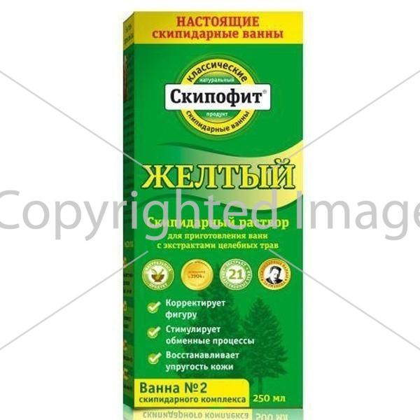 Фармакологічна діяЖовті скипидарні ванни викликають загальне збільшення внутрішньоклітинної температури, що призводить до прискореного згорянню хвороботворних агентів і надлишкових жирових відкладень. «Cкіпофіт жовтий» спалює внутрішньоклітинні жири, стимулює активне потовиділення і видалення через шкірні покриви токсинів, шлаків, хлористого кальцію, надлишку рідини, сечовини і т. Д.