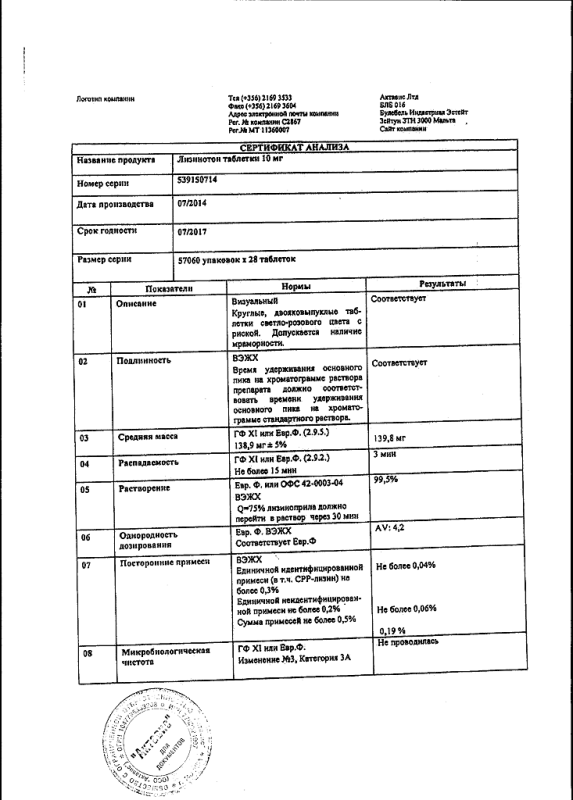 Фармакологическое действие Лизинотон - ингибитор АПФ, уменьшает образование ангиотензина II из ангио