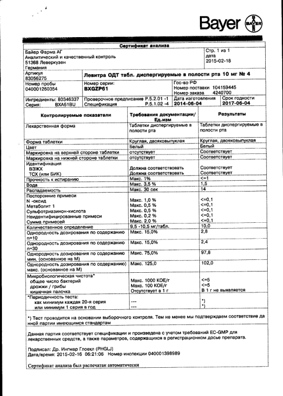 ЛевитраФорма выпускаТаблетки диспергируемые в полости ртаСостав1 таблетка содержит 10 мг варденафила