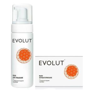 КРОК 1: Мило антибактеріальне ДЛЯ ОСОБИ І ТІЛА. Підтверджене дерматологами ефективний засіб від прищів, акне, шкірних запалень. Активна дія спрямована на відновлення і оздоровлення шкіри. За рахунок малого розміру наночастинки срібла проникають у внутрішні шари шкіри, знищуючи осередки розвитку бактерій і усуваючи всі шкірні запалення. Основу мила утворюють кокосове, касторове масла, органічні масла цитрусових і рослинний гліцерин. Вони оптимальні за складом для нашої шкіри і допомагають відновити структуру ліпідів шкірного бар'єру, нормалізує роботу сальних залоз і харчування шкіру корисними речовинами і мікроелементами. КРОК 2: ГЛИБОКО ОЧИЩАЄ, піна для вмивання. Це другий крок у системі EVOLUT по оздоровленню шкіри. Коли Мило нормалізовало роботу сальних залоз, переходите на умивання пінкою, її м'який pH не сушить шкіру. Дія спрямована на ретельне очищення, усунення запалень і профілактику їх повторного появи. Наночастки срібла в екологічному складі пінки покриті молекулами екстракту меліси алтайської і цитрусових масел. Тому проникаючи у внутрішні шари шкіри, вони не тільки усувають запалення, але і живлять шкіру корисними речовинами, вільно проникають через захисні бар'єри шкіри. Клітини, які потребують вітамінах та мікроелементах отримують їх під час вмивання.